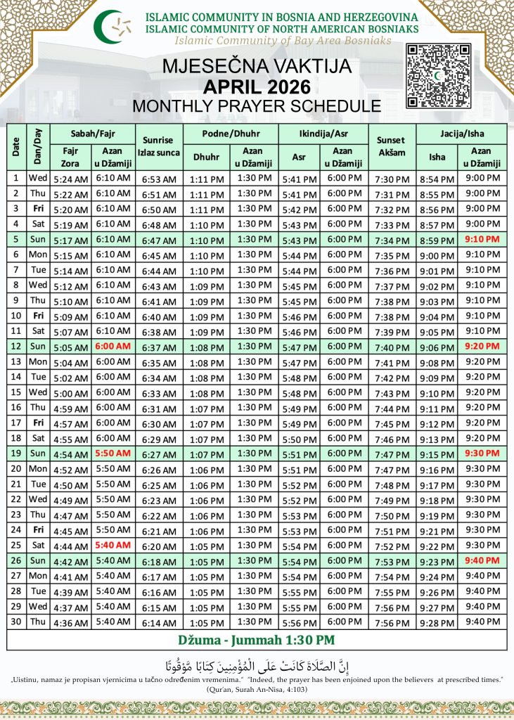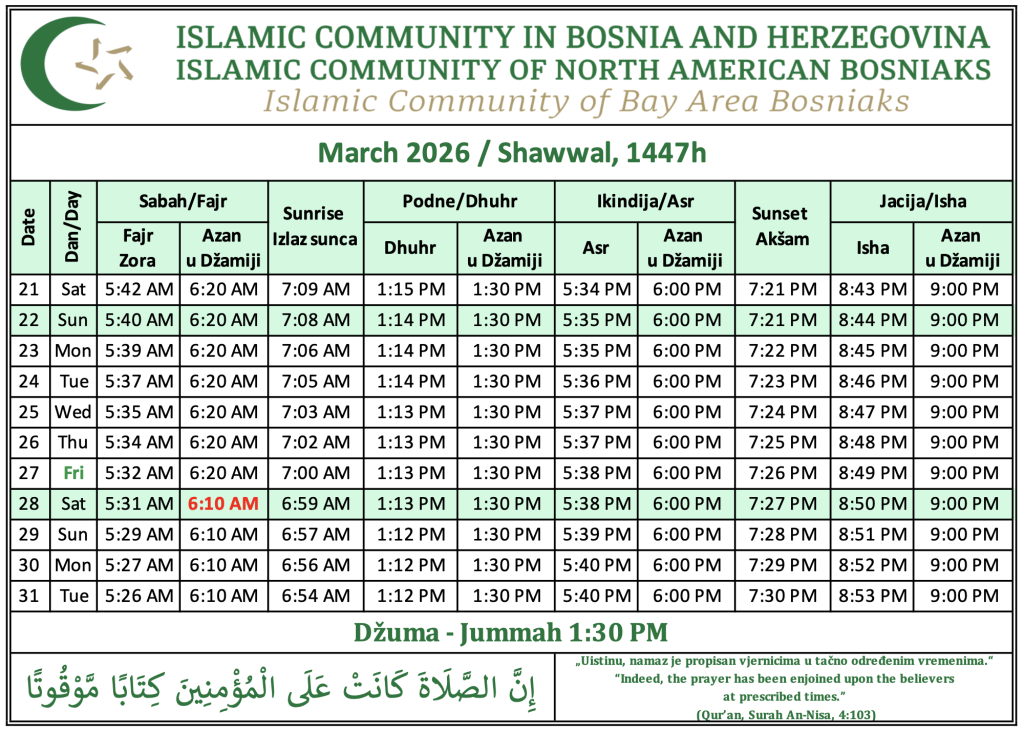Raspored i vaktiju za namaze možete pogledati u gornjem desnom uglu stranice. Džuma-namaz je u 12:30 The schedule and prayer…